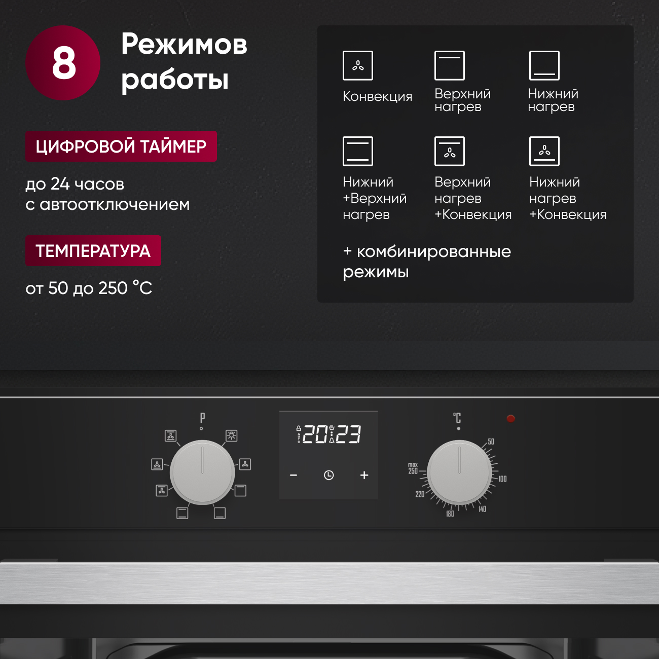 Кол-во функций - 8 режимов работы (Вентилятор, Верхний нагрев, Нижний нагрев, Нижний+Верхний нагрев, Верхний нагрев+Вентилятор, Нижний нагрев+Вентилятор, Нижний+Верхний нагрев+Вентилятор)