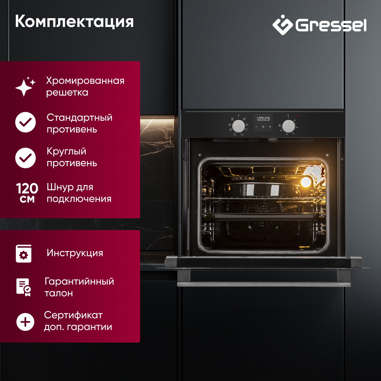 Духовой шкаф, инструкция, гарантийный талон, сертификат дополнительной гарантии, 1 решетка, 1 противень, 1 круглый противень, Шнур питания, Установочный комплект