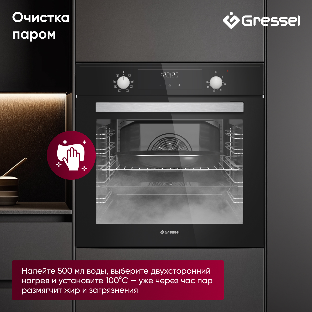 Очистка паром упрощает уход: достаточно налить 500 мл воды, установить температуру 100 °C и режим двухстороннего нагрева — через час пар размягчит загрязнения, и их будет легко удалить.