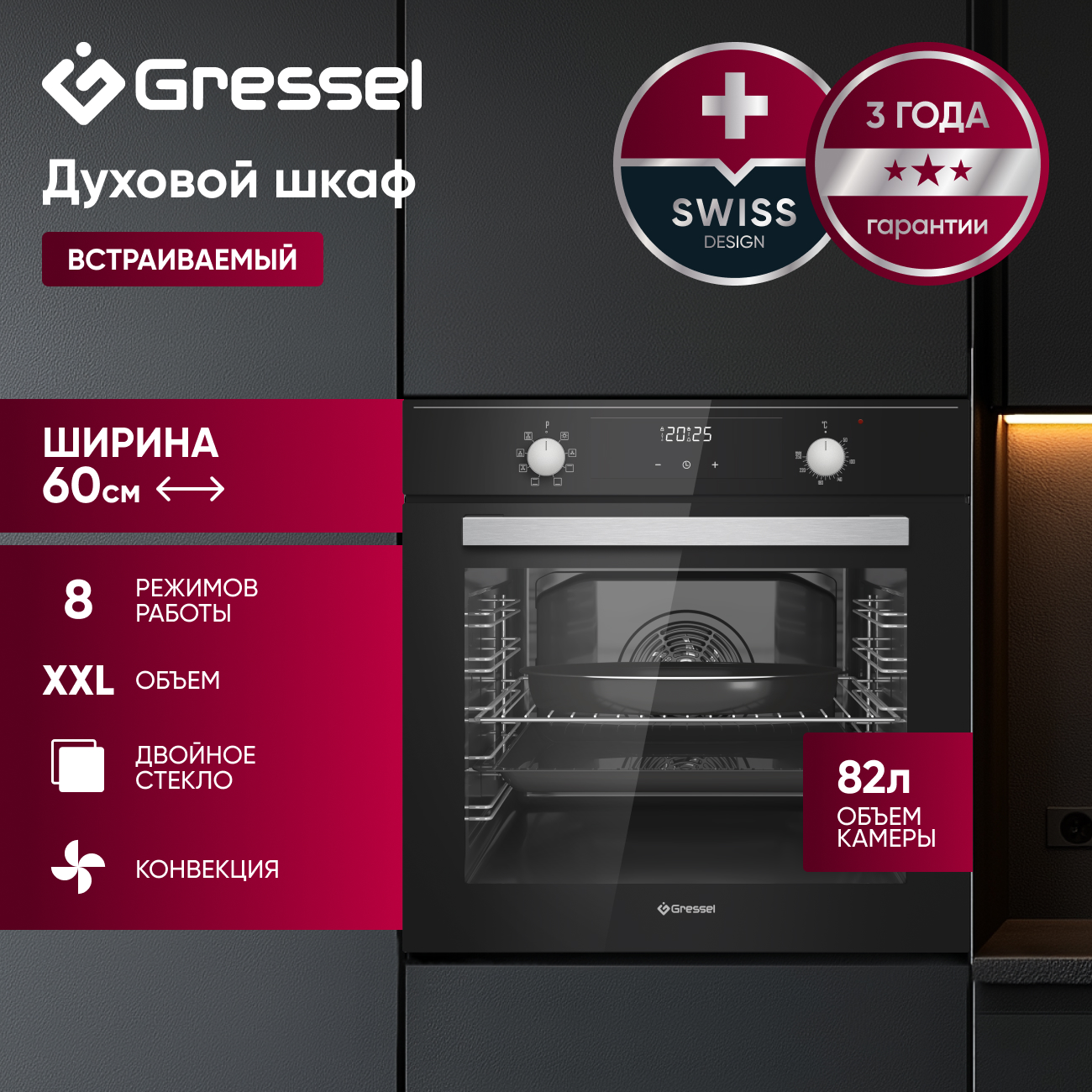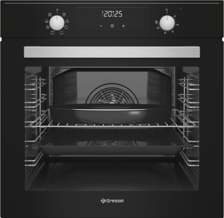 Встраиваемый духовой шкаф GRESSEL U6EB58200 60 см, 82л, XXL, 8 режимов, Конвекция, Двойное стекло, Активное охлаждение корпуса, черный