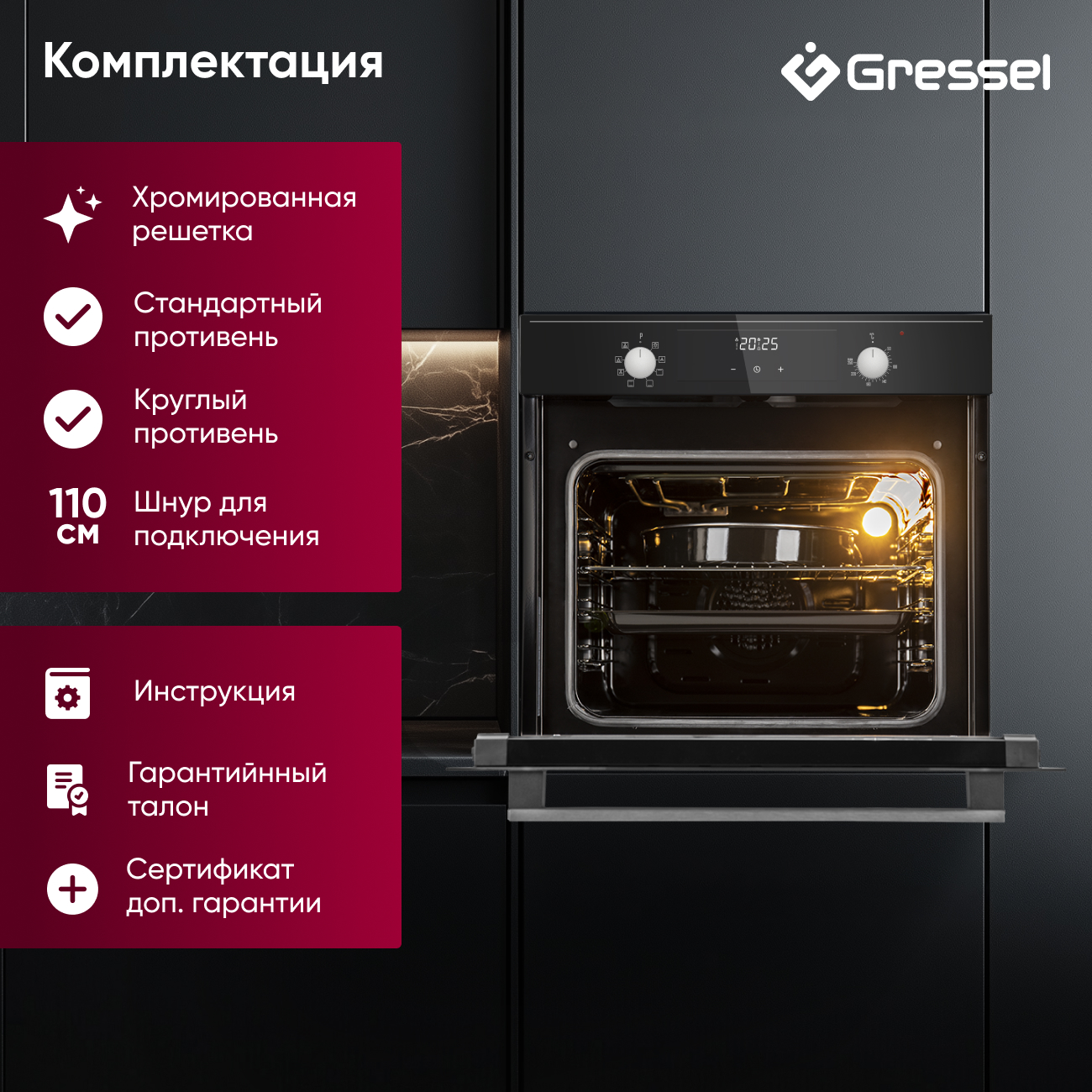 Духовой шкаф, инструкция, гарантийный талон, сертификат дополнительной гарантии, 1 решетка, 1 противень, 1 круглый противень, Шнур питания, Установочный комплект