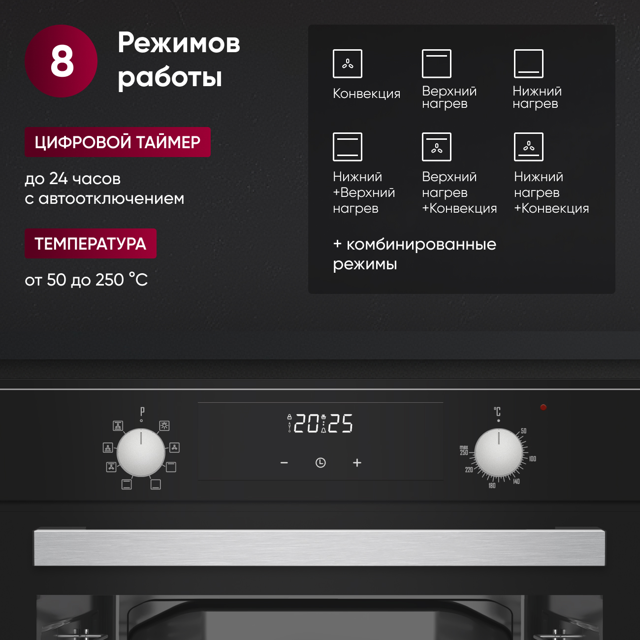 Диапазон температур (50–250 °C) даёт возможность выбирать оптимальный режим для любых рецептов — от медленного томления до интенсивного запекания.