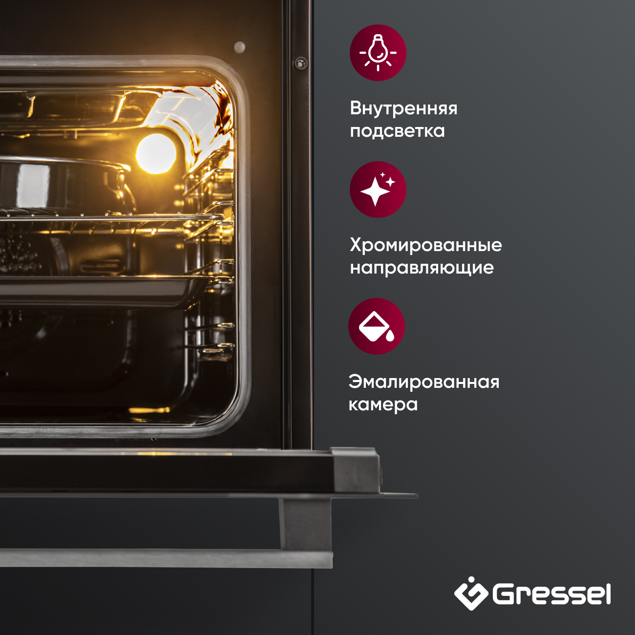 Хромированные направляющие надёжно фиксируют противни и решётку, обеспечивая удобство размещения посуды.