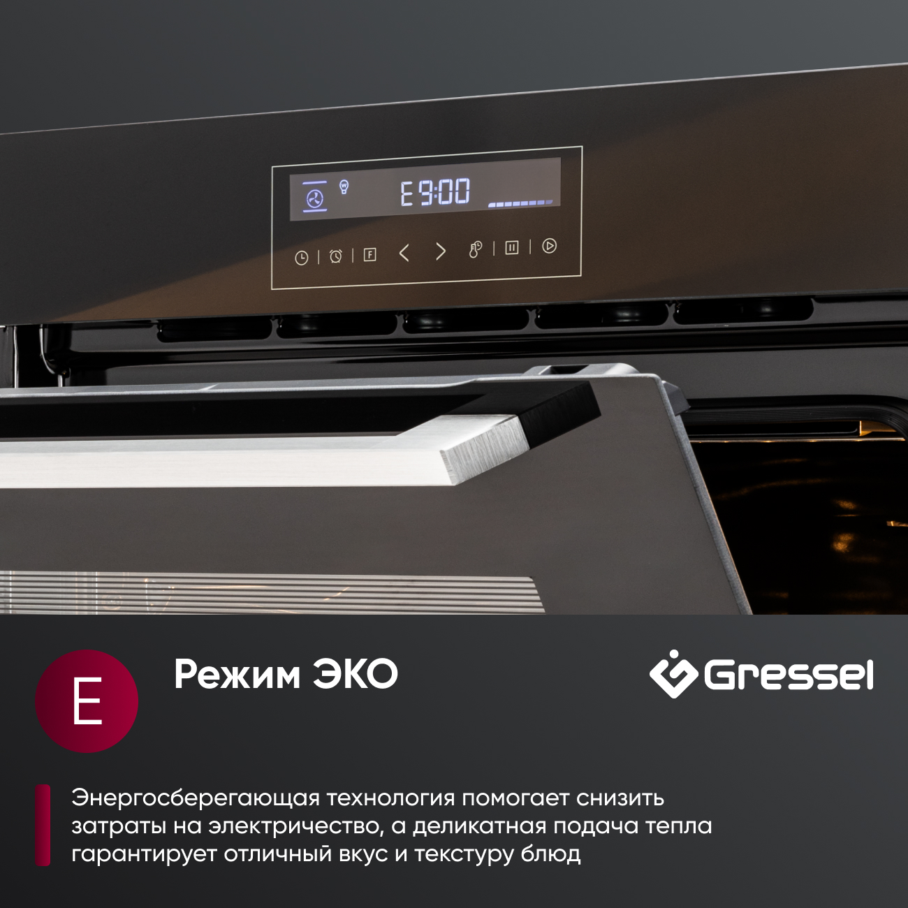 Минималистичное оформление в чёрном стекле универсально подходит к современной кухне, а утапливаемые переключатели дополняют аккуратный вид фронтальной панели. Gressel U6ES99001 понравится любителям технологичности и разнообразных программ, превращая рутинное приготовление пищи в удобный процесс с широким выбором настроек.