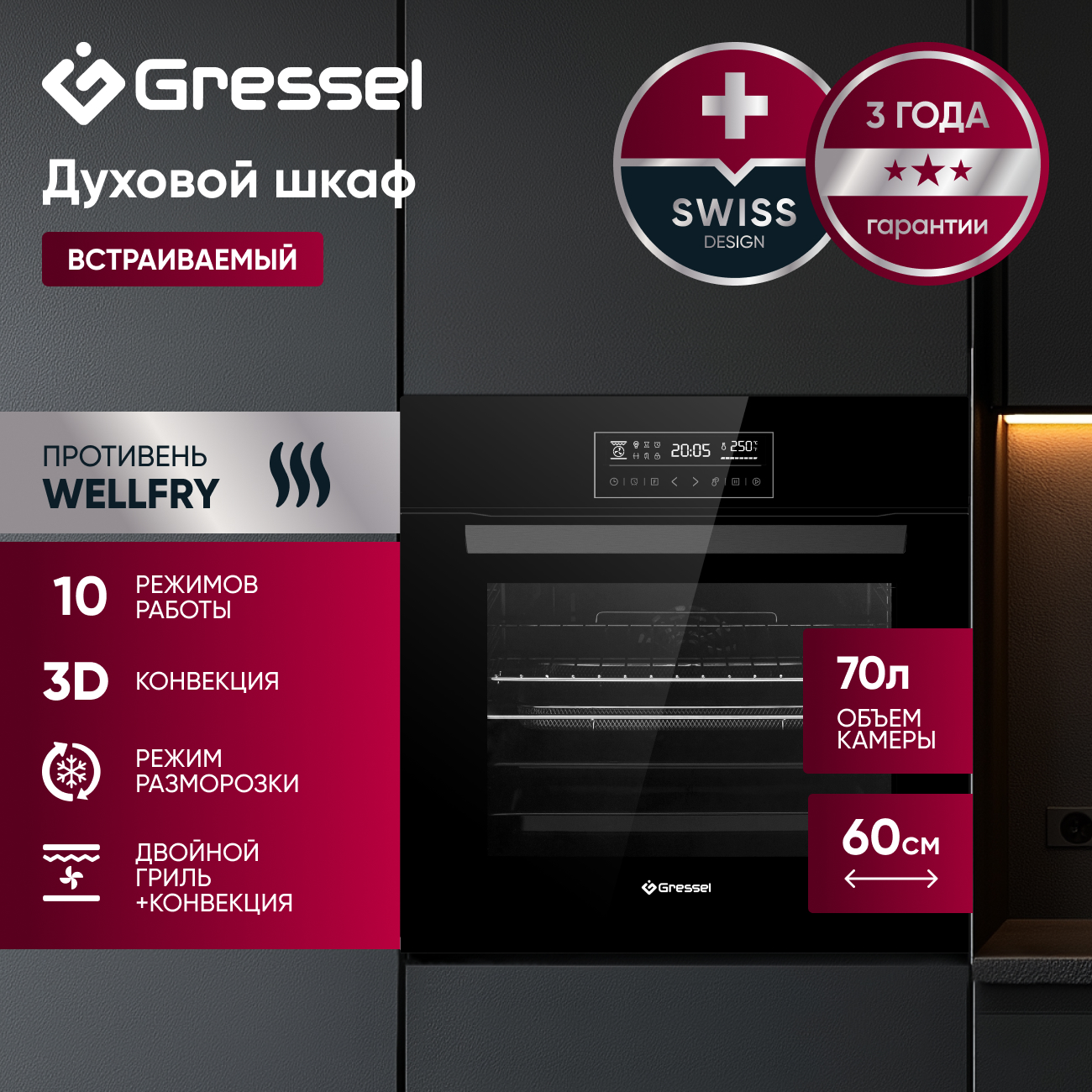 Встраиваемый духовой шкаф Gressel U6ES99001 60 см, 10 функций, сенсорный дисплей, двойной гриль, конвекция + решетка Wellfry