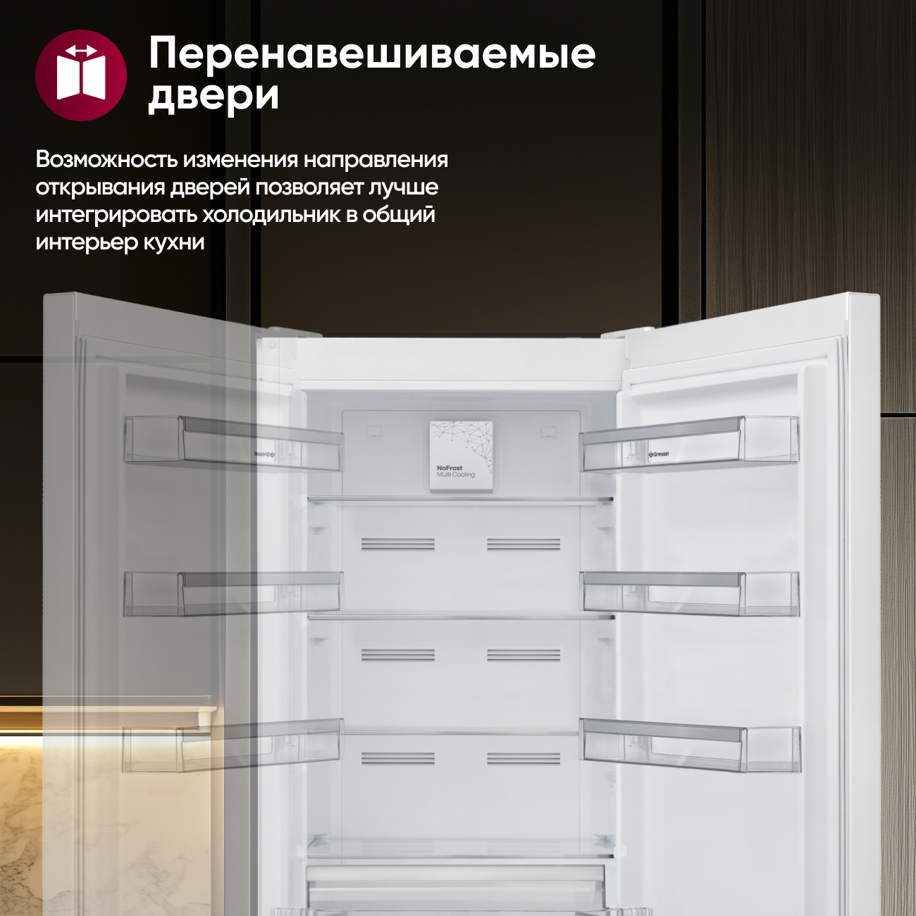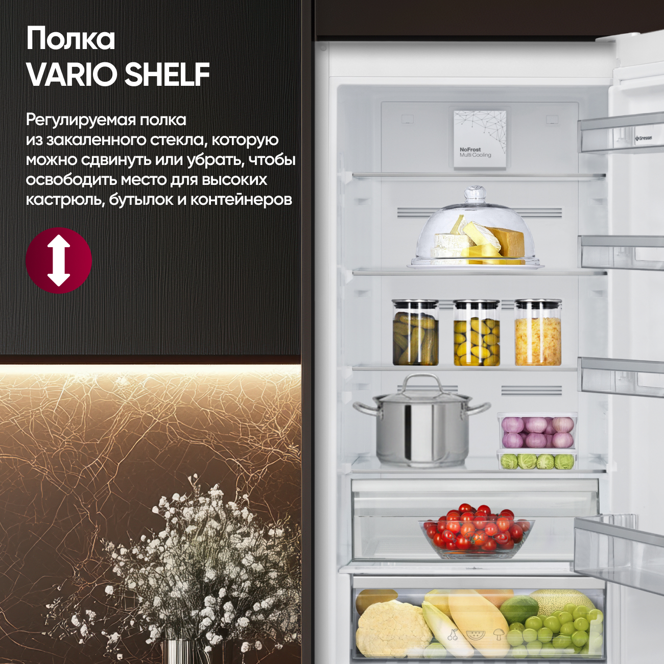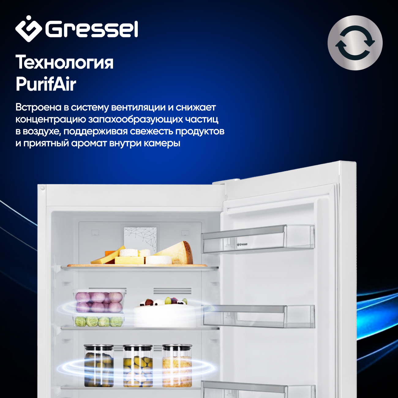 Безопасность и надёжность обеспечены системой сигнализации открытой дверцы и индикацией «Предупреждение о неисправности». Внутреннее пространство организовано с заботой о пользователях: регулируемые полки, зона свежести, отделение для фруктов и овощей, отсек для яиц и лоток для льда. Особая технология PurifAir нейтрализует неприятные запахи, сохраняя воздух внутри чистым и свежим.