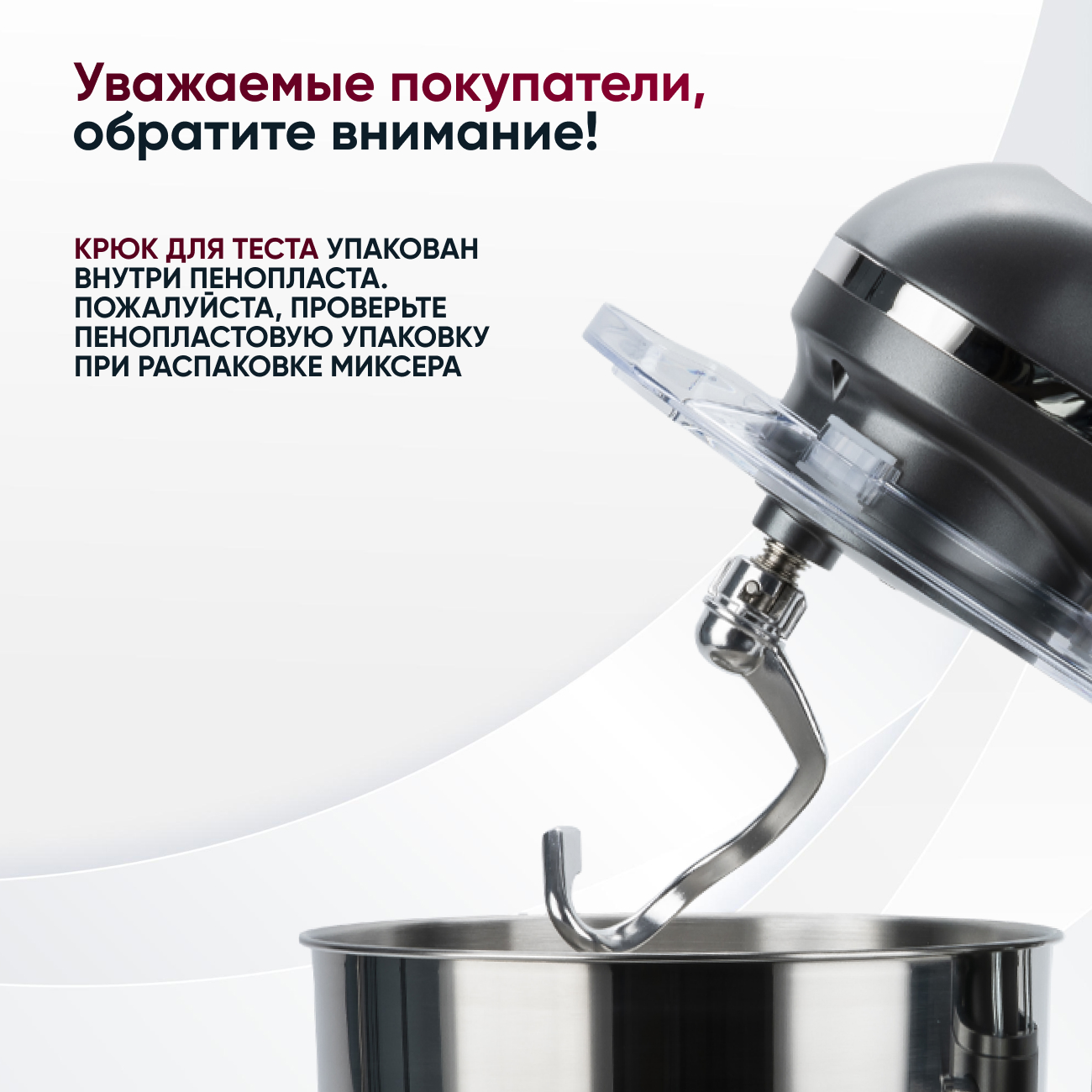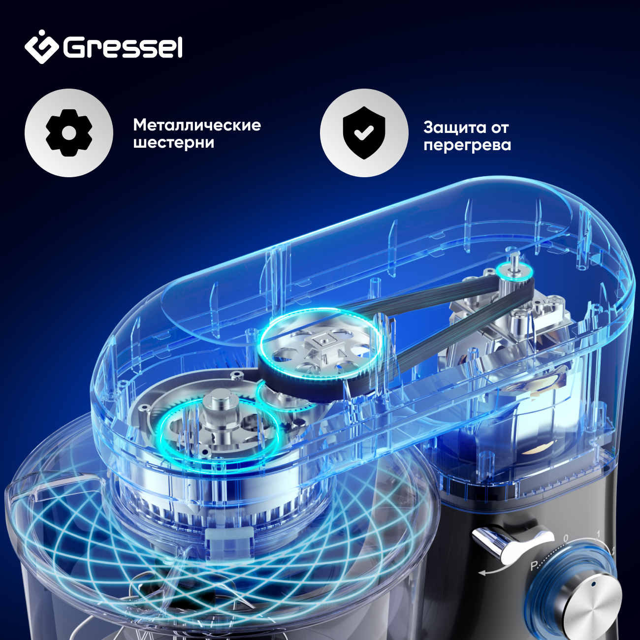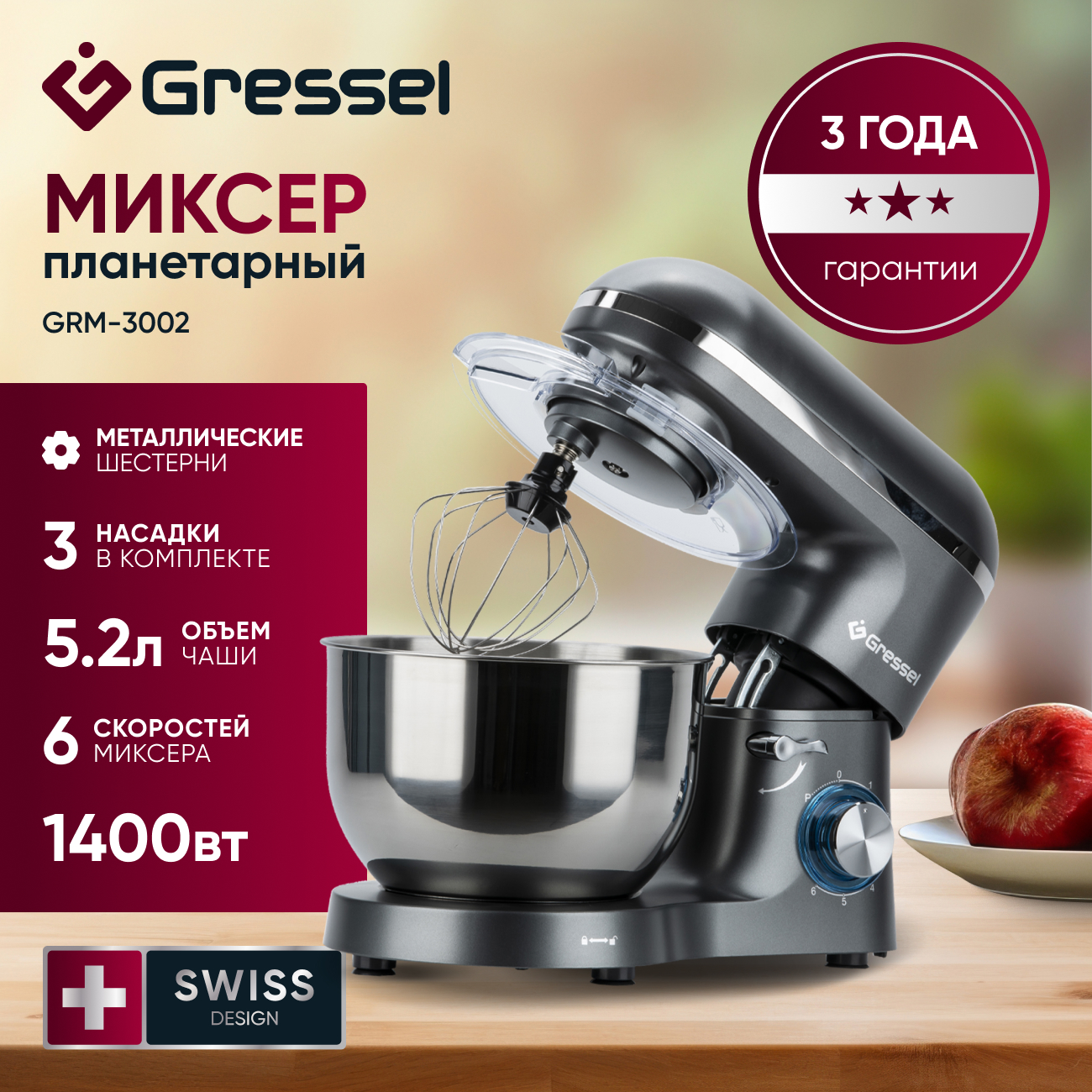 Планетарный миксер Gressel GRM-3002 с чашей, 1400 Вт, 6 скоростей, серый