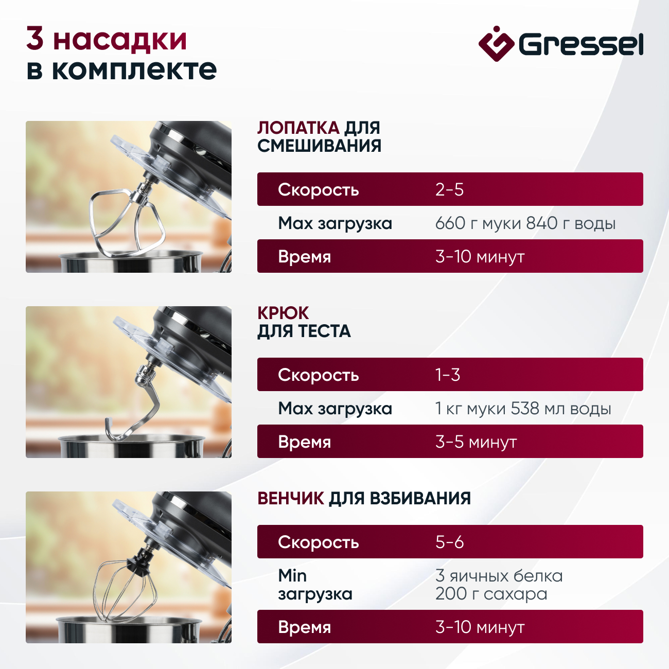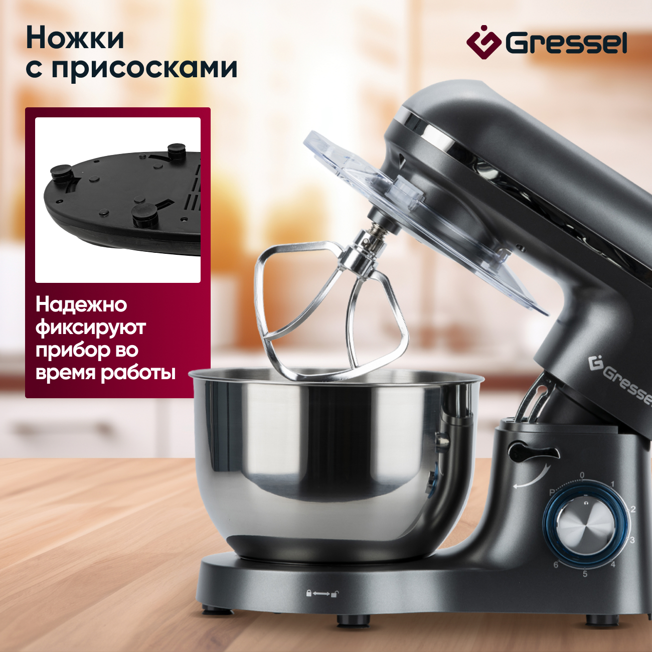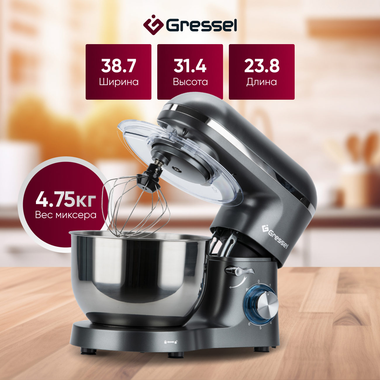 Миксер выполнен в стильном сером цвете, что делает его элегантным и модным аксессуаром на кухне. Благодаря своей функциональности и удобству использования, планетарный миксер Gressel GRM-3002 станет незаменимым помощником на вашей кухне.