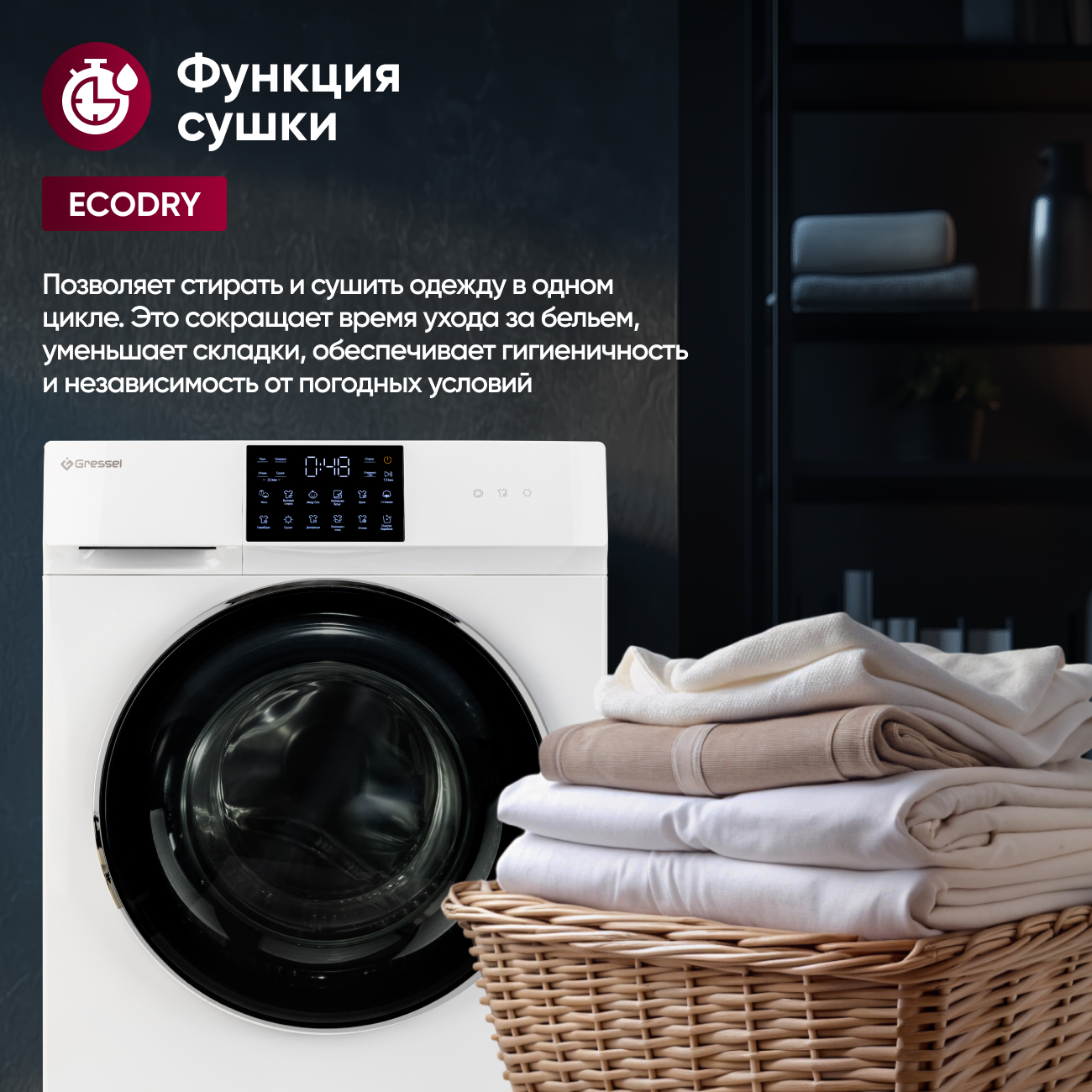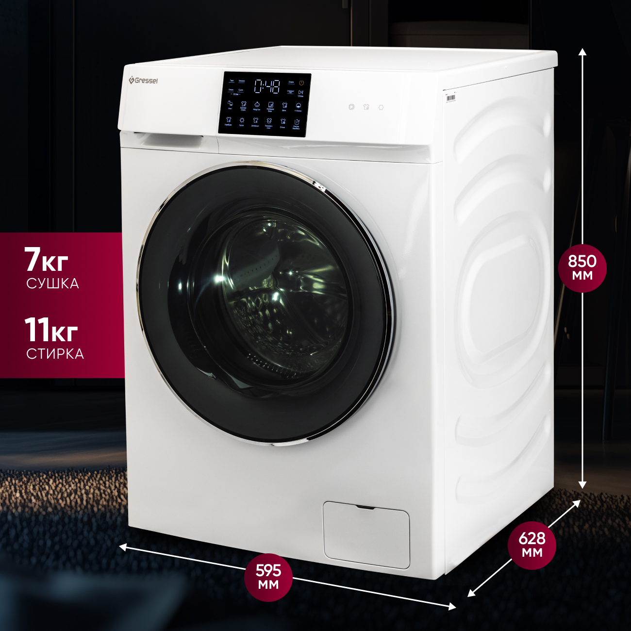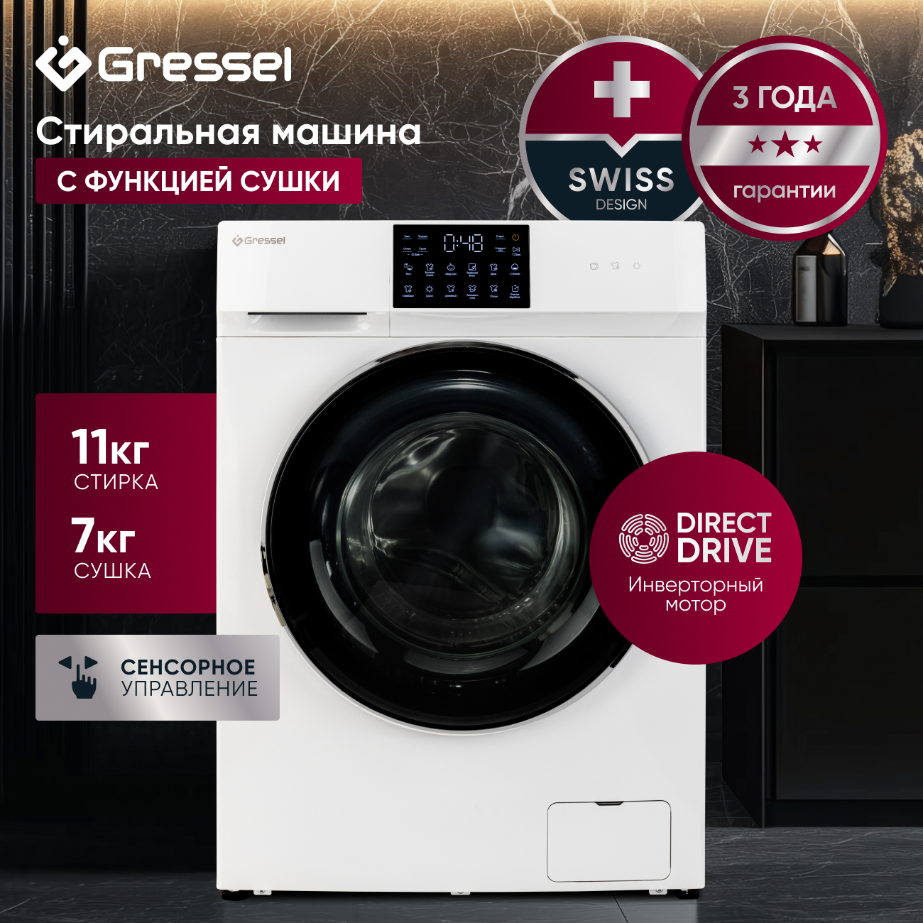 Gressel USS602 объединяет функции стиральной и сушильной машины, предлагая полноценный цикл ухода за бельём от стирки до готовности к хранению. Вместимость барабана — до 11 кг для стирки и 7 кг для сушки. Инверторный двигатель прямого привода обеспечивает тихую и надёжную работу, минимизирует вибрации и увеличивает срок службы техники.