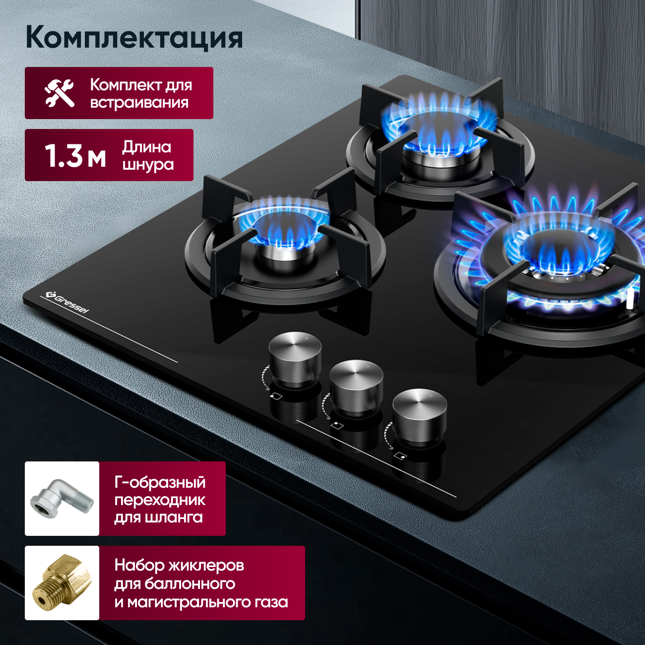 Комплектация: Включает комплект для встраивания, набор жиклеров для баллонного газа и шнур длиной 1,3 м.