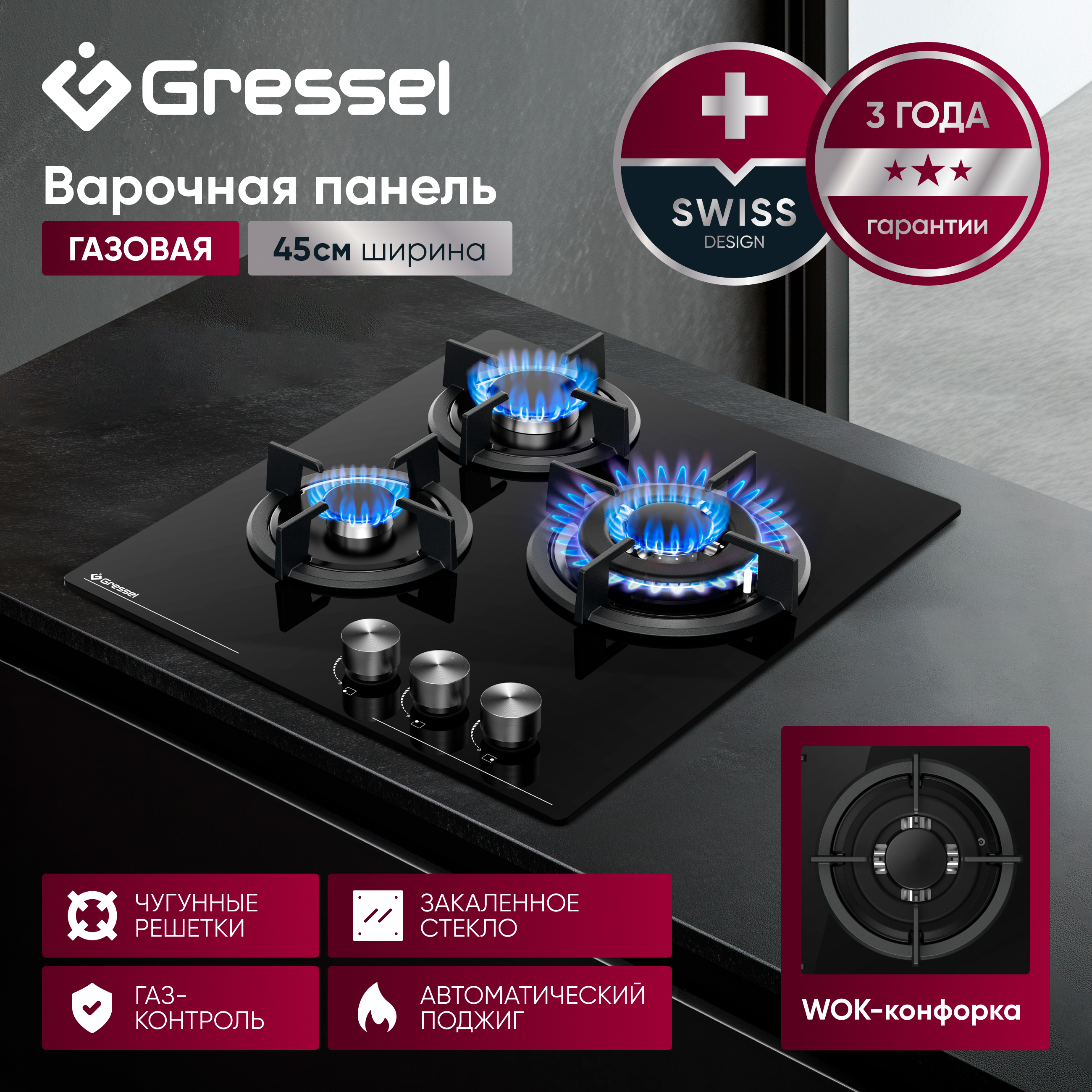 Газовая варочная панель GRESSEL U45N35S000 45 см, закаленное стекло, WOK-конфорка, автоматический розжиг, газ-контроль, чугунные решетки