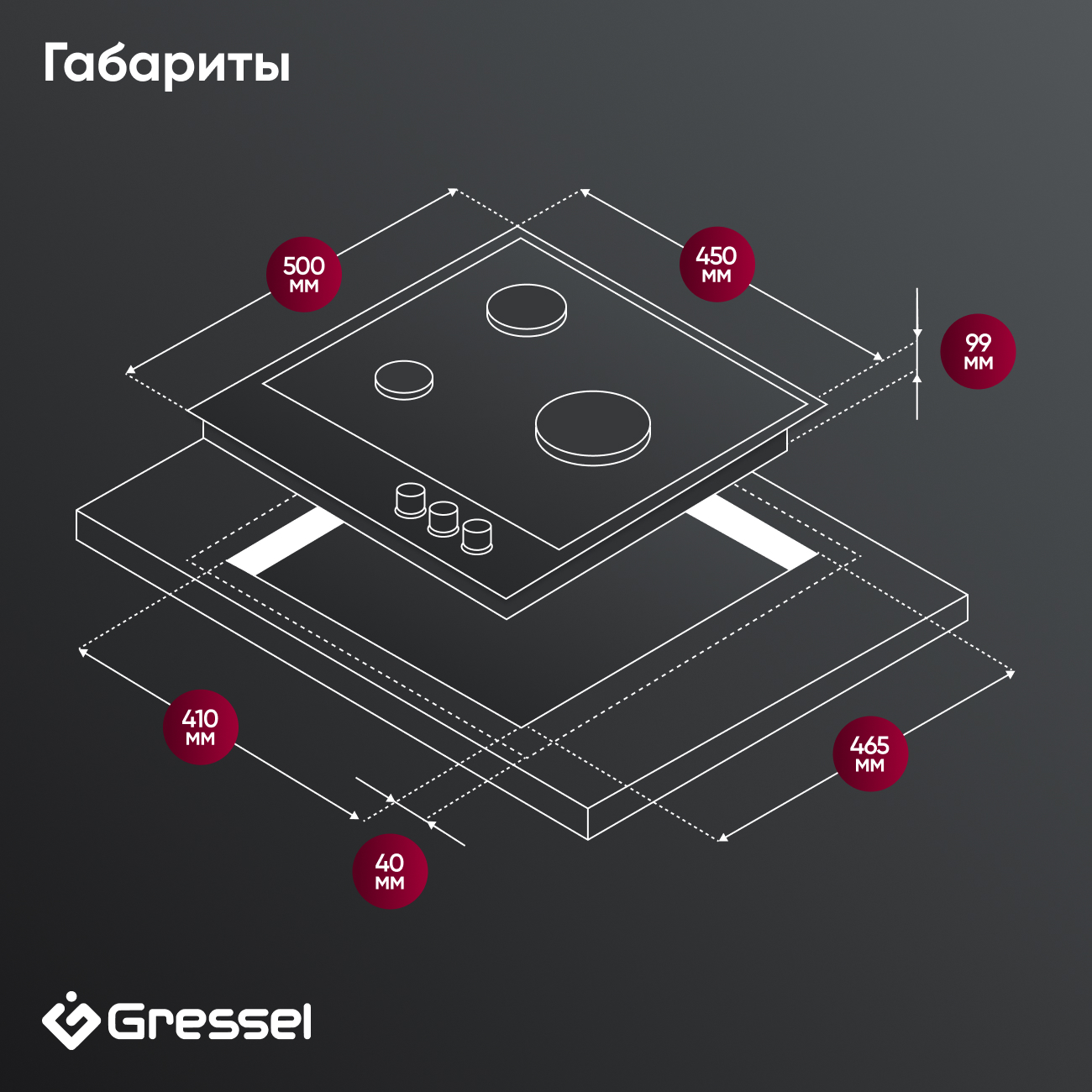 Габариты: Внешние размеры – 450x500x99 мм, размеры для встраивания – 410x465 мм. Подходит для столешниц с минимальной толщиной 40 мм.