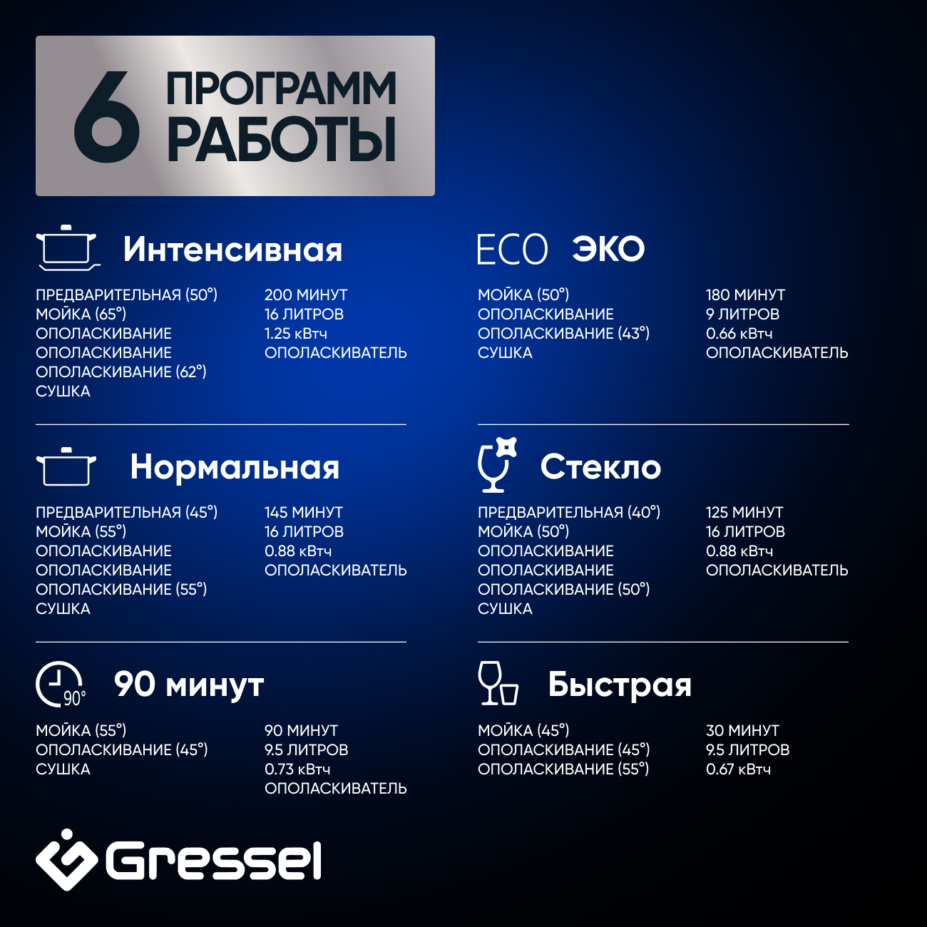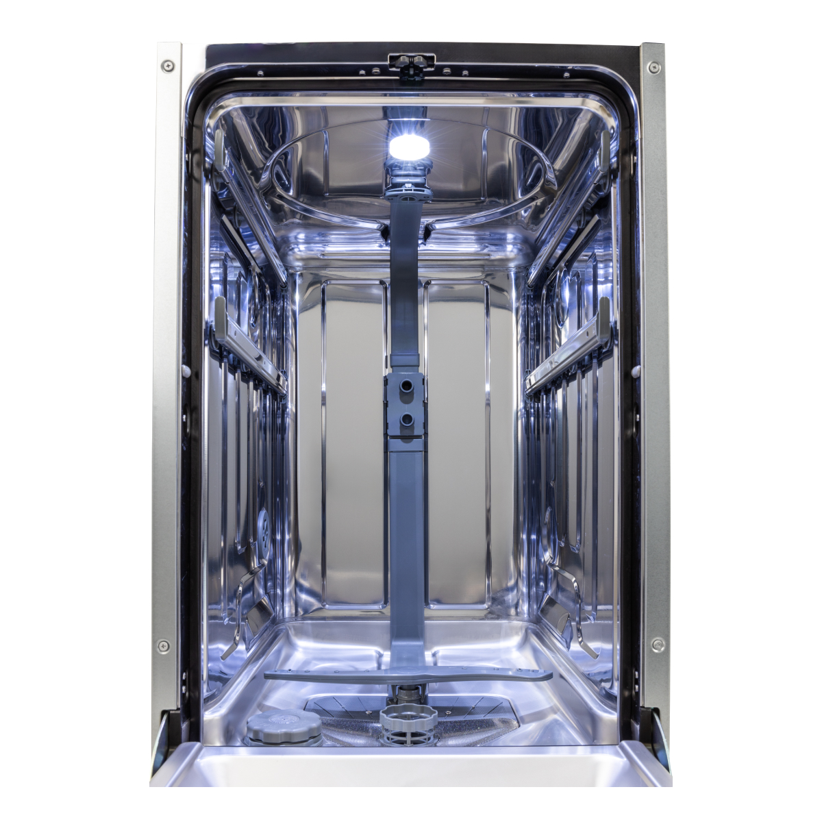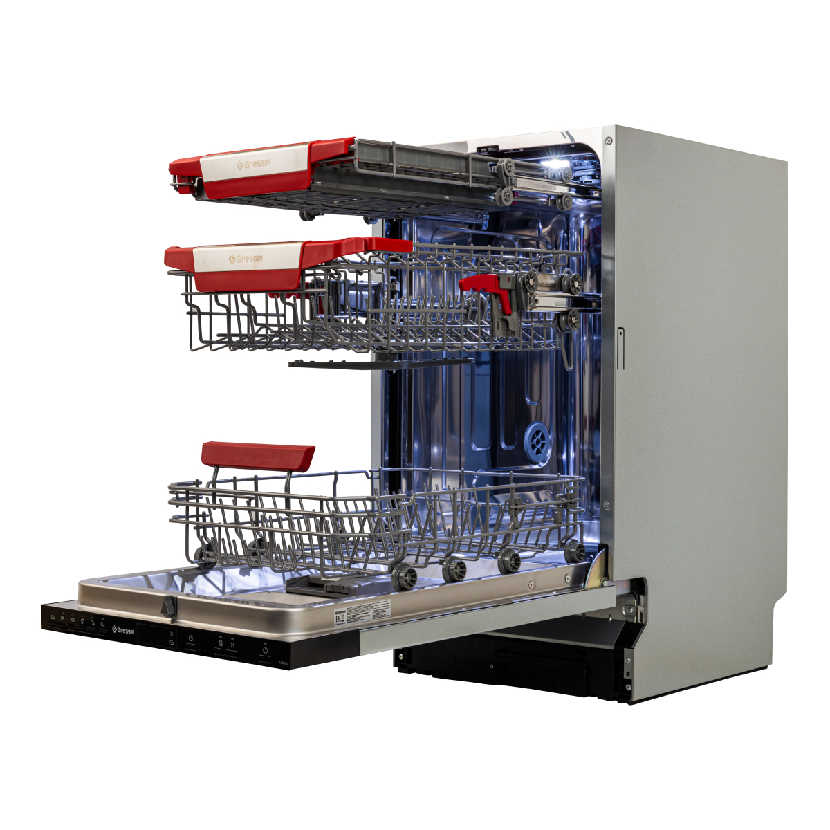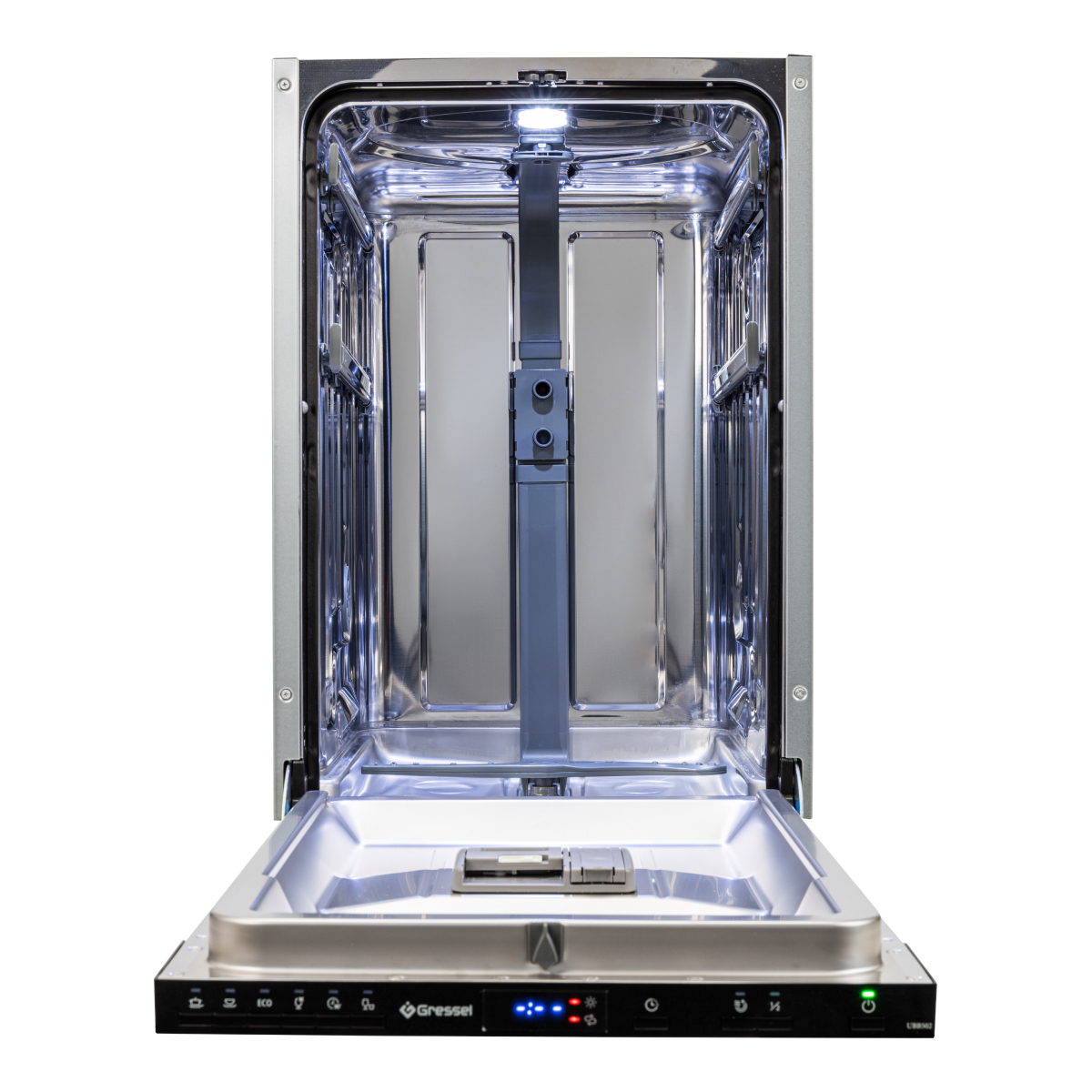 Познакомьтесь с Gressel UBB502 — узкой встраиваемой посудомоечной машиной, которая сочетает компактные размеры и впечатляющую функциональность. Несмотря на ширину всего 45 см, она вмещает до 10 комплектов посуды и предлагает 6 программ, включая «Интенсивную», «ЭКО», «Стекло» и «Быструю». Кроме того, «90-минутный» режим позволяет вымыть и высушить посуду в сжатые сроки без потери качества.