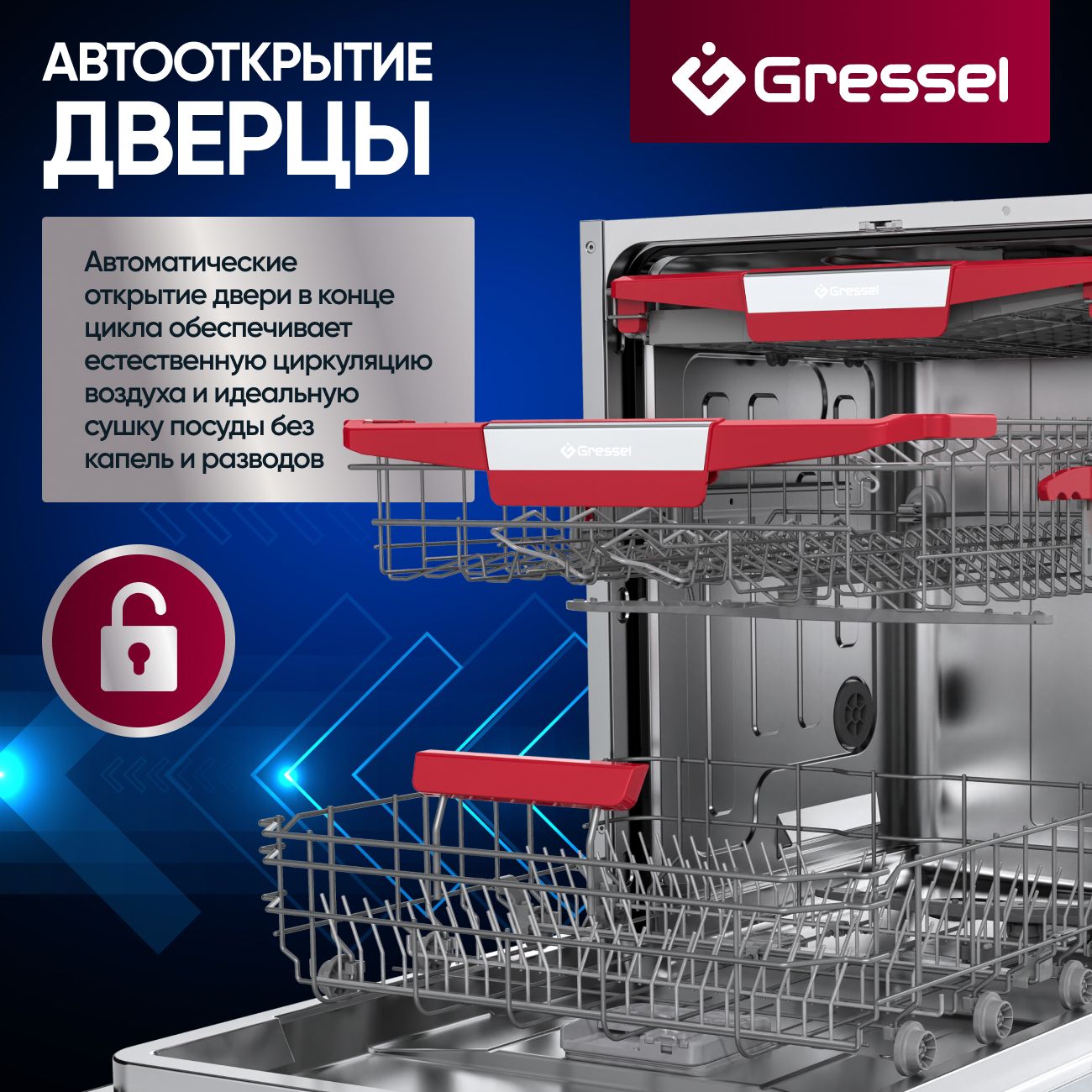 Повысьте комфорт на кухне с помощью Gressel UBB602 — полноразмерной встраиваемой модели, рассчитанной на 14 комплектов посуды. Помимо 6 стандартных программ (интенсивная, нормальная, эко, стекло, быстрая, 90 мин), эта машина предлагает ряд интересных функций, включая автоматическое открытие дверцы по завершении цикла. Благодаря такой особенности посуда быстрее высыхает естественным образом, дополнительно экономя энергию.